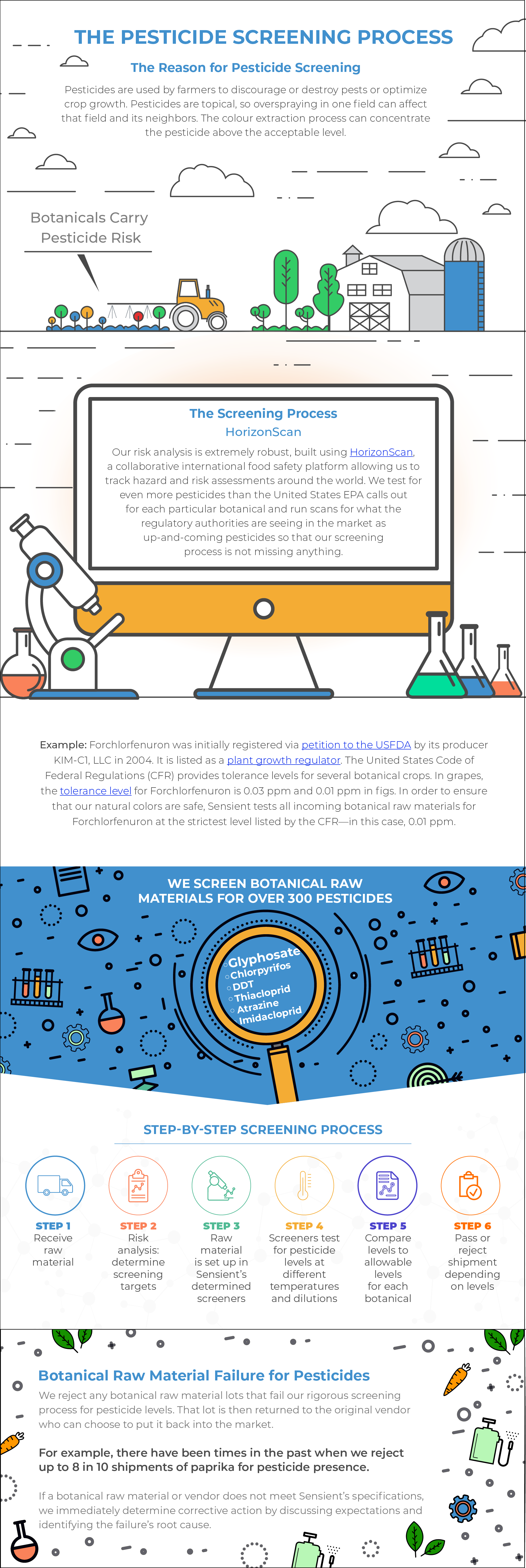 Natural color manufacturers and suppliers are directed by the regulatory authorities to test raw botanical materials for natural food colors “to the best of their ability”. At Sensient, food safety is one of our core values, so our safety protocols are prioritized to ensure we are delivering natural color solutions of the highest quality in terms of safety requirements. A natural color solution from Sensient should never cause a product to be recalled for exceeding specified levels of items like pesticides or heavy metals, because we test every batch of botanicals for the following: